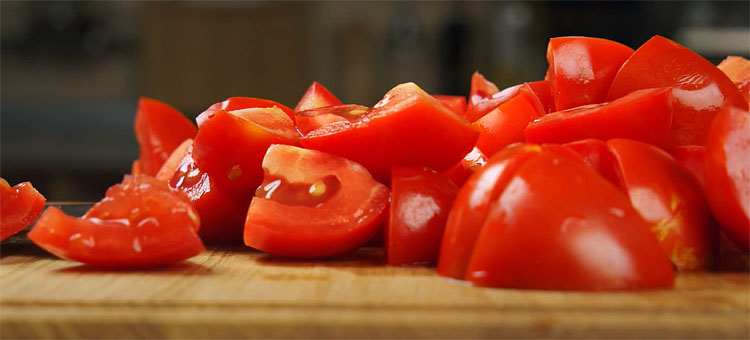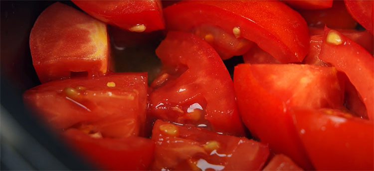 2. Разогрейте сотейник и добавьте в него растительное масло. Поместите четвертинки помидоров в сотейник с разогретым маслом. Обжаривайте помидоры на среднем огне в течение 15 минут, чтобы часть влаги выпарилась.