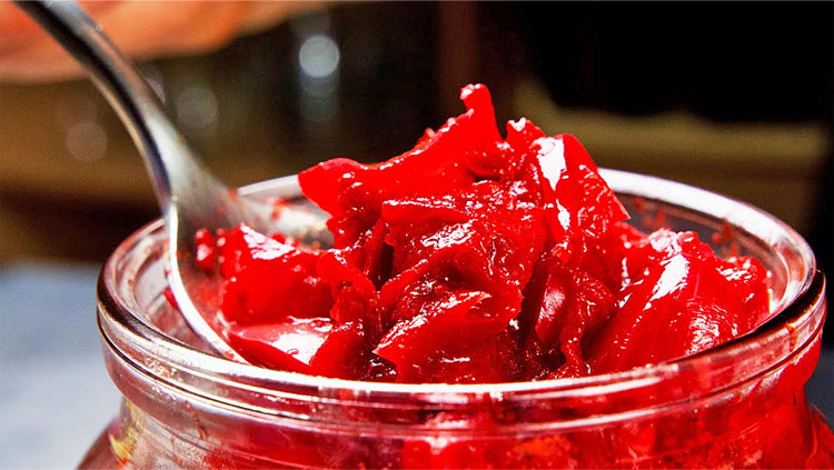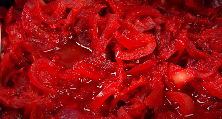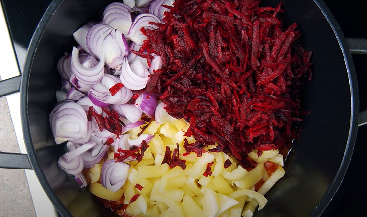 3. После того как помидоры выпарились, добавьте в сотейник натертую свеклу, нарезанный лук и мелко нарезанный болгарский перец. Посыпьте солью и сахаром для баланса вкуса.