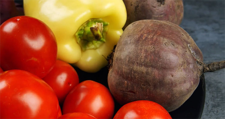1. Нарежьте помидоры на четвертинки. Выберите спелые и сочные помидоры. Лук нарежьте на полукольца. Болгарский перец очистите от семян и нарежьте мелкими кусочками. Свеклу очистите и натрите на крупной терке.