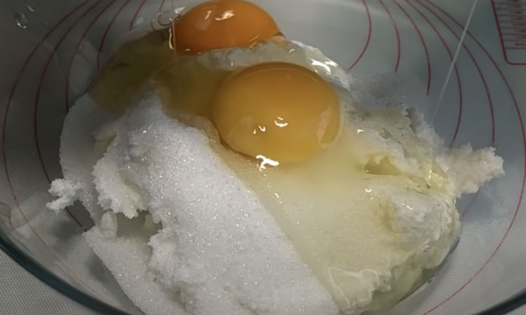 В глубокую миску перекладываем творог, засыпаем его сахаром, разбиваем сверху яйца и перемешиваем в однородную массу.