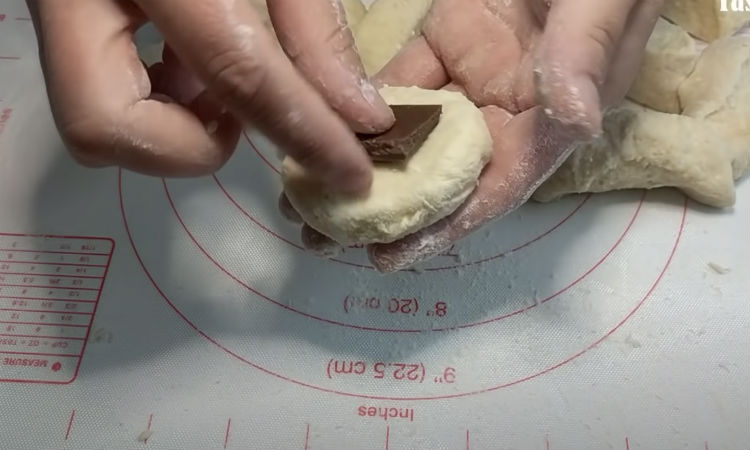 Делим тесто на небольшие кусочки, из каждого формируем лепешку, а в центр кладем кусочек шоколада и сворачиваем в шарик.