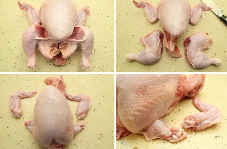 С курицы срезать с двух сторон грудки вместе с крыльями. Удалить нижнюю часть крыла, оставив лишь одну косточку — ее необходимо зачистить. Снять кожу, отделить малое и большое филе. Малое филе раскрыть, слегка отбить оба филе, посолить и поперчить. Застывшее масло выложить на большее филе, накрыть малым и завернуть так, чтобы котлета приобрела первоначальную форму.