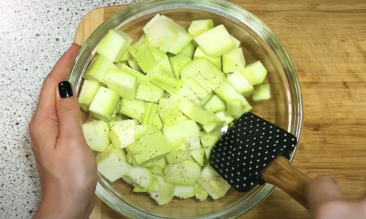 Нарезаем кабачок крупными ломтиками, перчим и солим. Ставим пока в сторону.