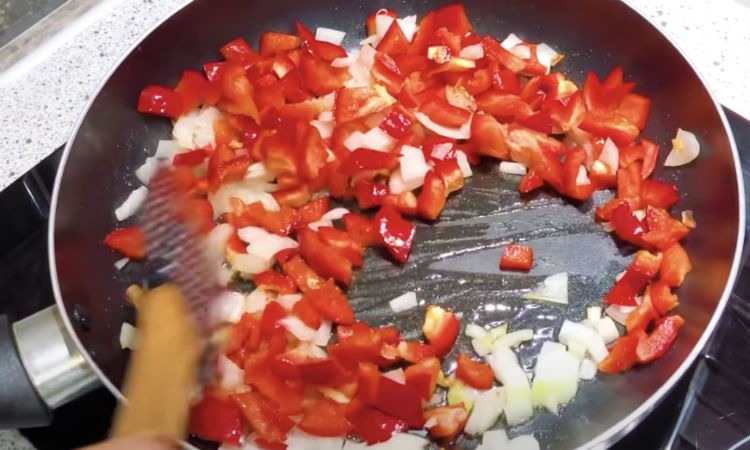 Следом добавляем на сковороду мелко порезанный болгарский перец, жарим все вместе под крышкой около 4 минут.