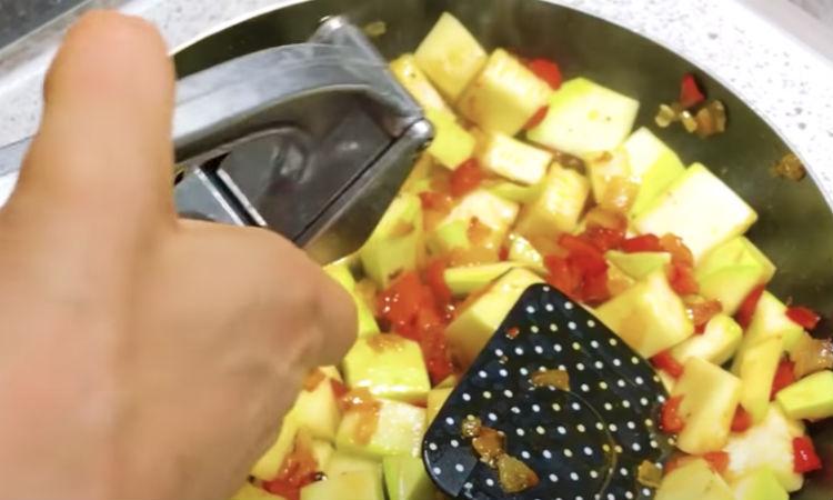 Перекладываем к овощам кабачок, выдавливаем через пресс пару зубчиков чеснока. Снова накрываем крышкой и оставляем на 5-7 минут.