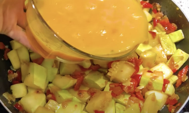 Яйца разбиваем в миску и взбалтываем с перцем и паприкой. Затем заливаем яйцами кабачок на сковородке. Оставляем под крышкой, пока яйца не схватятся.