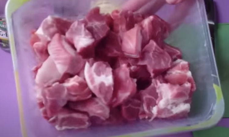 Мясо режем кусочками толщиной примерно 3-4 сантиметра.