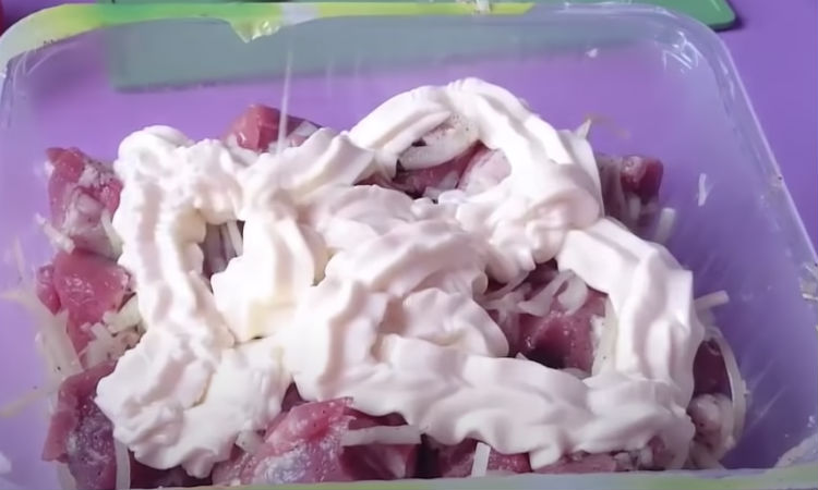 Маринадов для шашлычного мяса десятки, но большинство из них сосредоточено на придании мясу вкуса. Мы же сделаем ставку на сочность: приготовим маринад из пачки майонеза — майонез прекрасно справляется с размягчением жестких волокон и уже при жарке не дает мясу пересохнуть.