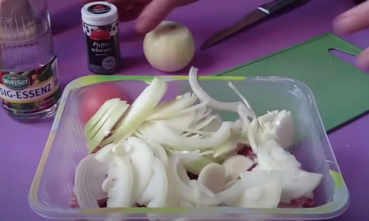 Две головки лука режем тонкими слайсами и добавляем в мясо. Сверху перчим, солим и перемешиваем, пусть лук даст сок.