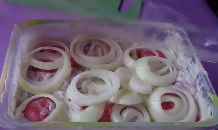 Третью головку лука нарезаем кольцами потолще — это нужно уже для жарки. Также нарезаем и помидор, кладем их сверху на мясо, контейнер с мясом затягиваем пленкой. Пусть постоит несколько часов для маринада.