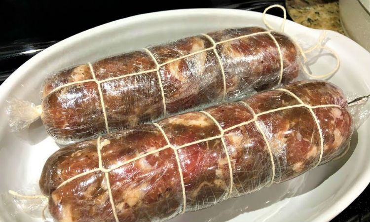 Затем формируем батоны в пищевой пленке, концы фиксируем бечевкой, ей же перевязываем колбасу.