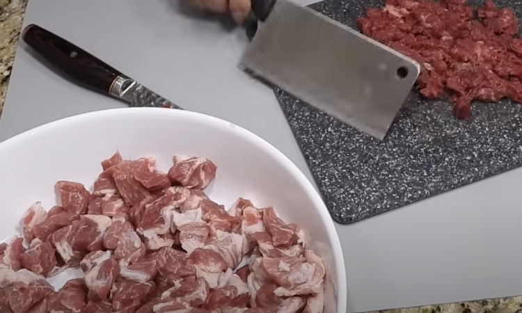 Свинину режем небольшими кусочками, а говядину измельчаем как можно мельче — она будет связывать более крупные куски мяса.