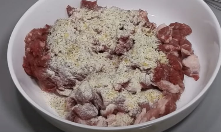 Кладем все мясо в одну миску и засыпаем специями и солью.