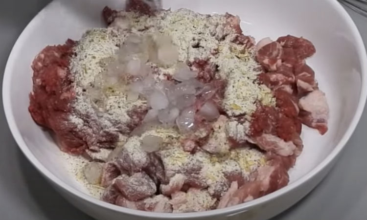На килограмм свинины средней жирности возьмем полкило говядины, столовую ложку сухого лука, 1/2 чайной ложки сухого чеснока, 21 грамм обычной соли, 4 грамма соли нитритной, 20 граммов сухого молока (оно поможет избежать бульонного отека), чайную ложку сахара, 1/2 чайной ложки черного молотого перца, столько же мускатного ореха и 240 миллилитров ледяной воды.