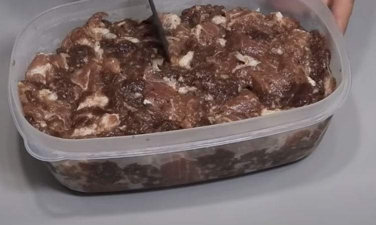 Теперь вымешиваем мясо около 10 минут. Ставим мясо под крышкой в холодильник, лучше на ночь.