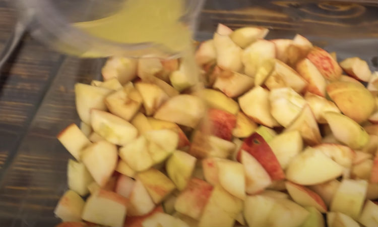 Смазываем форму для выпекания сливочным маслом, перекладываем в нее яблоки. Выжимаем сок половины лимона и поливаем им яблоки. Засыпаем яблоки двумя столовыми ложками сахара, добавляем корицу и как следует перемешиваем. Сверху посыпаем яблоки сушеной клюквой – вместо нее можно использовать изюм, орехи или любые другие сухофрукты.