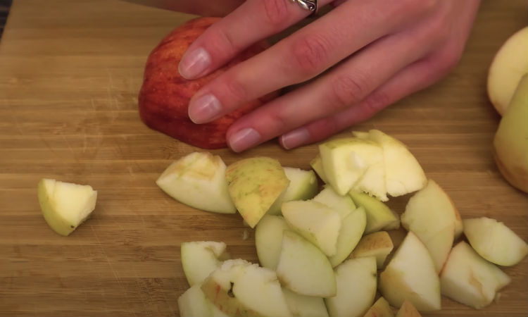 Яблоки режем пополам и сердцевину убираем, затем нарезаем их небольшими кубиками.