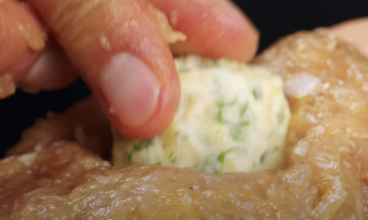 Первым мы для начинки сделаем сырное масло. Просто смешиваем сливочное масло с натертым сыром и петрушкой, затем скатываем все в небольшие шарики и ставим в морозилку минут на 15.