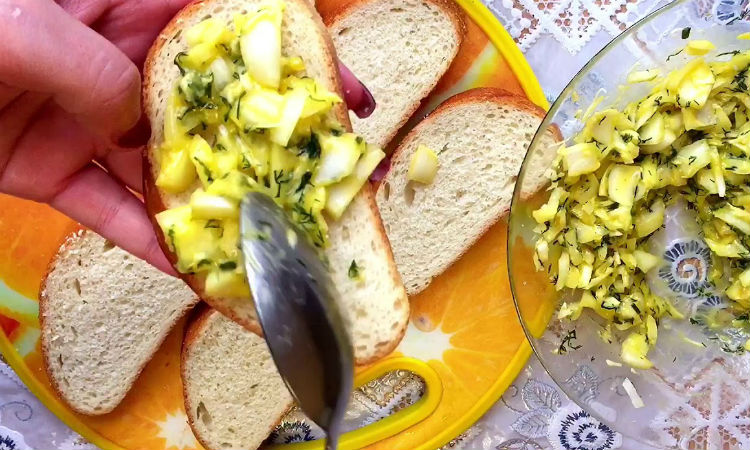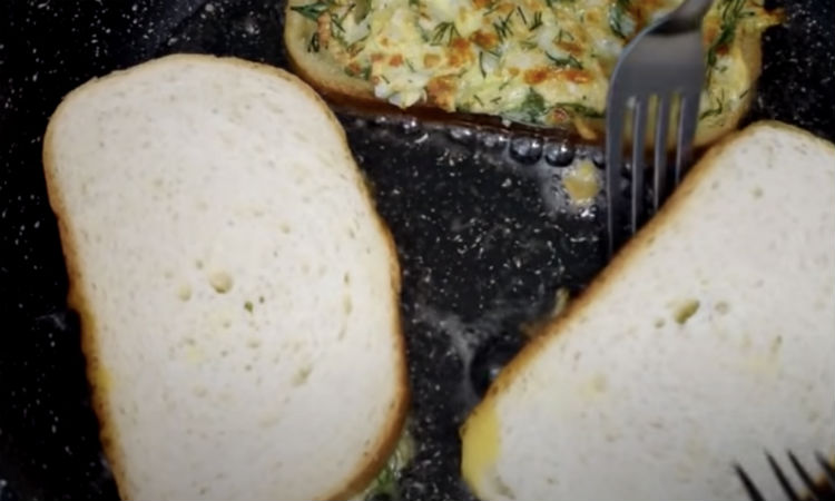 Разогреваем на сковороде растительное масло и кладем хлеб луково-яичной смесью вниз. Затем переворачиваем и жарим уже до готовности.