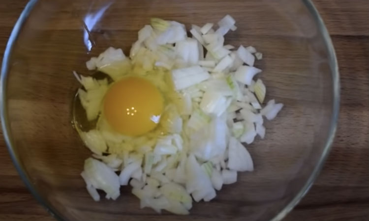 Шинкуем мелко лук и перекладываем его в глубокую миску. Туда же разбиваем яйцо и трем на крупной терке сыр.