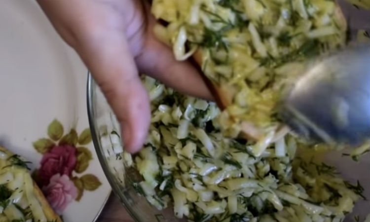 Также добавляем в миску мелко нарезанный укроп, солим и перчим. Перемешиваем все вместе, разбиваем еще одно яйцо и снова перемешиваем. Следующей добавляем к смеси муку, перемешиваем и сразу наносим получившуюся начинку на хлеб.