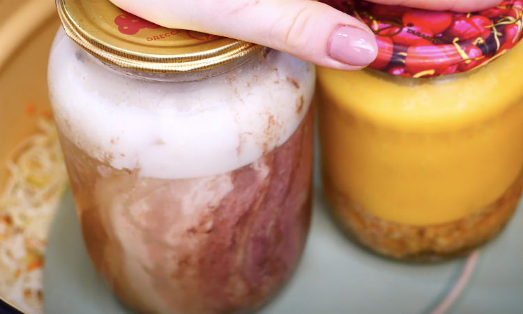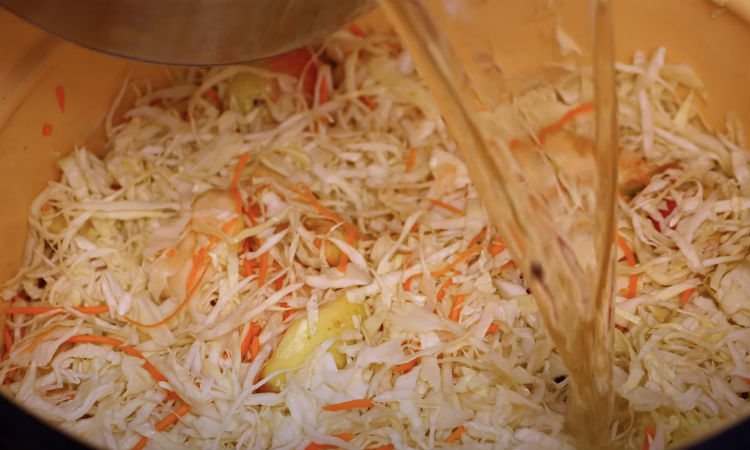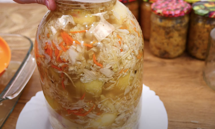 Оставляем капусту под гнетом и крышкой на трое суток, пусть заквасится. А после просто перекладываем капусту по банкам и оставляем до зимы.