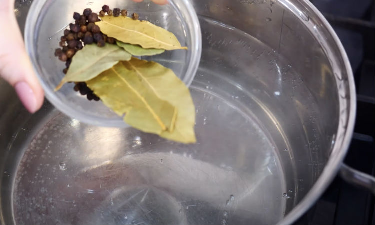 Начинаем с приготовления рассола. В воду добавляем лавровые листики, перец горошком, соль и мед. Перемешиваем, ставим на плиту и выключаем огонь как только рассол закипит.