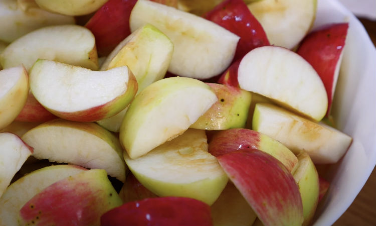 Яблоки режем на четвертинки, плодоножки и семечки обязательно убираем.