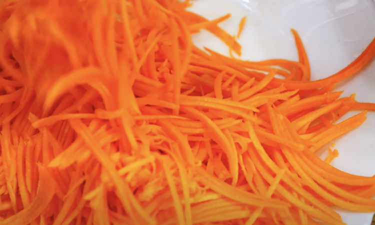 Морковь также натираем на терке, добавляем к капусте и перемешиваем.