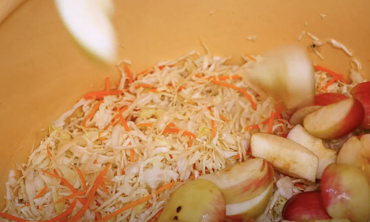 Следом добавляем яблоки и также перемешиваем — старайтесь укладывать капусту, морковь и яблоки слоями.