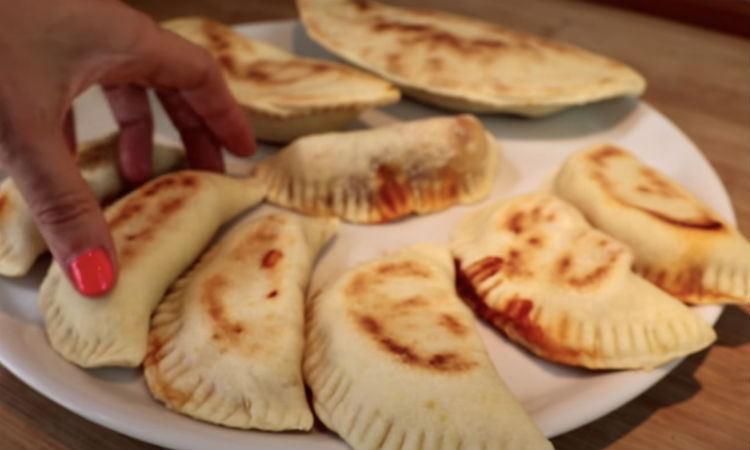 Для приготовления быстрого теста нам понадобится 250 граммов муки, 140 миллилитров воды, 1/2 столовой ложки разрыхлителя, 2 столовые ложки оливкового масла и по половине чайной ложки сахара и соли. Начинкой возьмем только сыр и томатную пасту, но эти пирожки хороши с любой начинкой — можно, например, положить уже обжаренный фарш, или картофельное пюре.