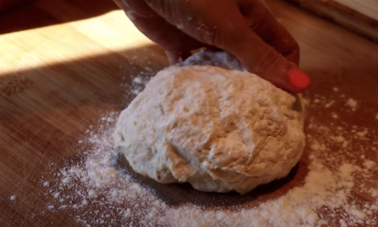 Все ингредиенты смешиваем в удобной миске. Замешиваем быстрое тесто — оно получится плотным, почти не липнущим к рукам.