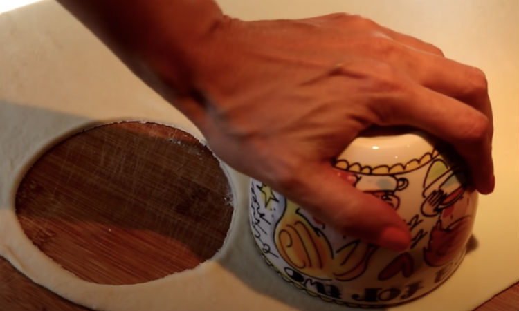 Раскатываем тесто в лепешку и вырезаем заготовки нужного размера. Удобно делать это обычной чашкой.