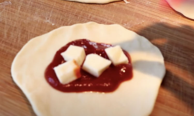 Кладем в каждую заготовку начинку из небольшого количества томатного соуса и нескольких кусочков моцареллы.
