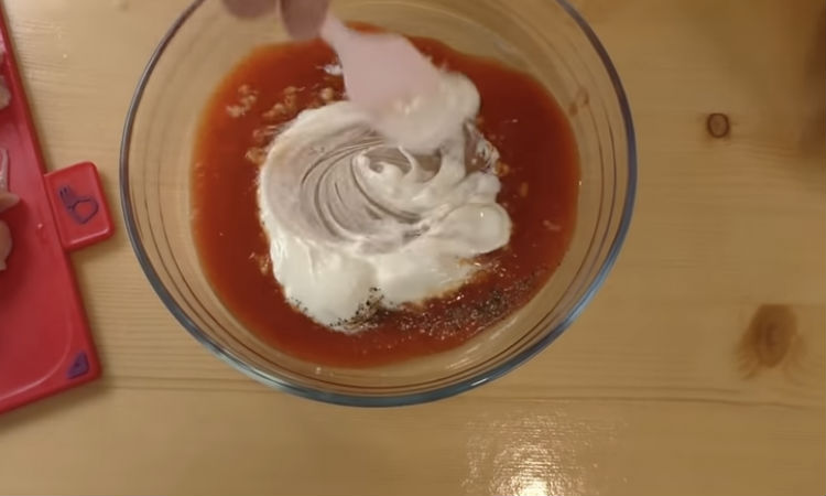 Для маринада в удобной миске смешиваем сметану, томатную пасту, соль, чеснок и перец.