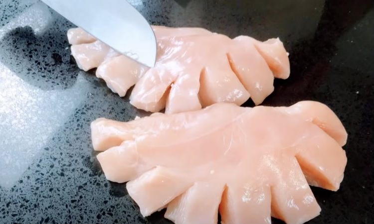 На каждой грудке по одной стороне делаем надрезы примерно в полтора сантиметра, как на фото ниже: