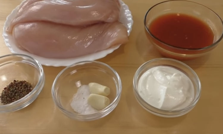На 3 среднего размера куриных филе возьмем 2 зубчика чеснока, 5 столовых ложек томатной пасты, 2 столовых ложки сметаны, яйцо, немного муки, сухари для панировки, соль и черный перец.