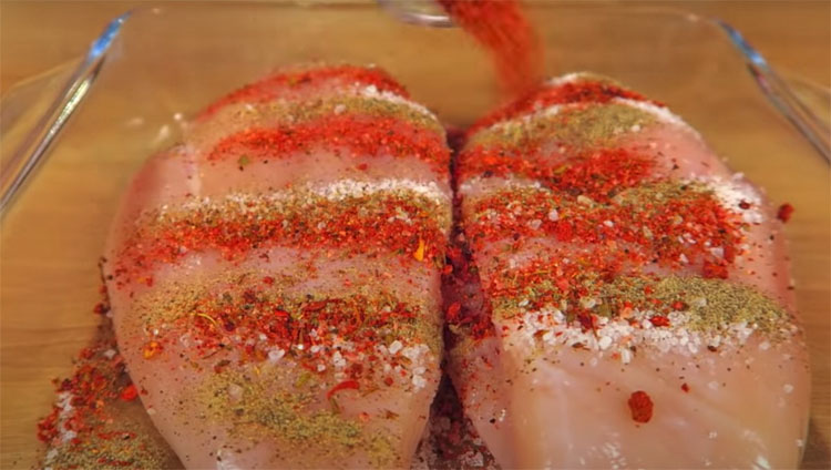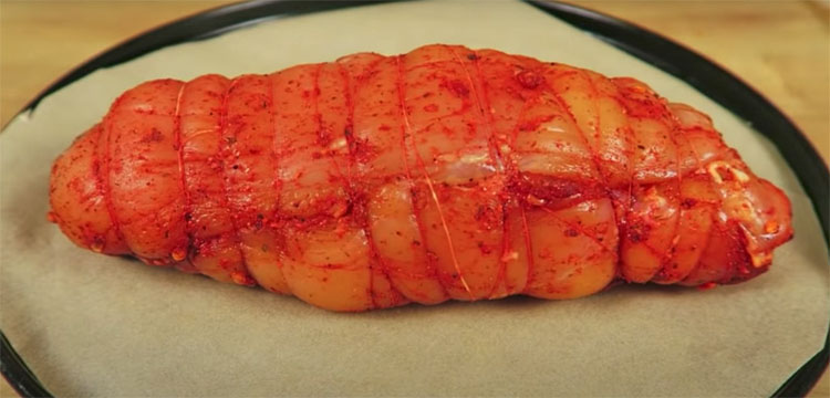 Сначала грудки хорошо промаринуем специями, после чего свернем в рулет и обмотаем бечевкой.