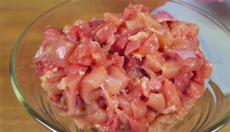 Ингредиенты аналогичны прошлому рецепту: 700 граммов куриного филе, 420 граммов куриного бедра (брать нужно без кожи и без кости), лук, лавровый лист, перец, чеснок, мускатный орех, свекольный сок и желатин.