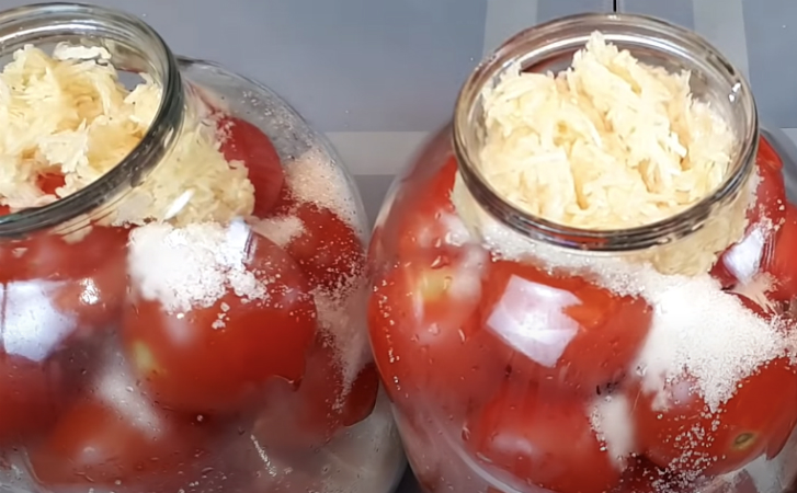 В традиционных рецептах маринованных помидоров обычно используются листья хрена, укроп, петрушка, что делает все закатки примерно одинаковыми и слишком уже привычными. Лучше закатаем томаты более простым и интересным способом, «под снегом». Основным ингредиентом выступит чеснок, а в результате получится так вкусно, что банка будет уходить за минуты.