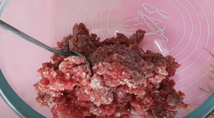 Как раз есть время заняться начинкой. В отдельную миску кладем 200 граммов фарша, к нему добавляем 2 нарезанных кубиками картофелины и две мелко нарезанных луковицы. Посыпаем все зирой по вкусу, добавляем соли, 4 столовые ложки воды и 3 столовые ложки растительного масла.