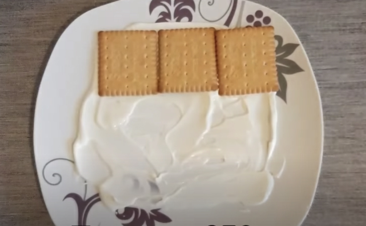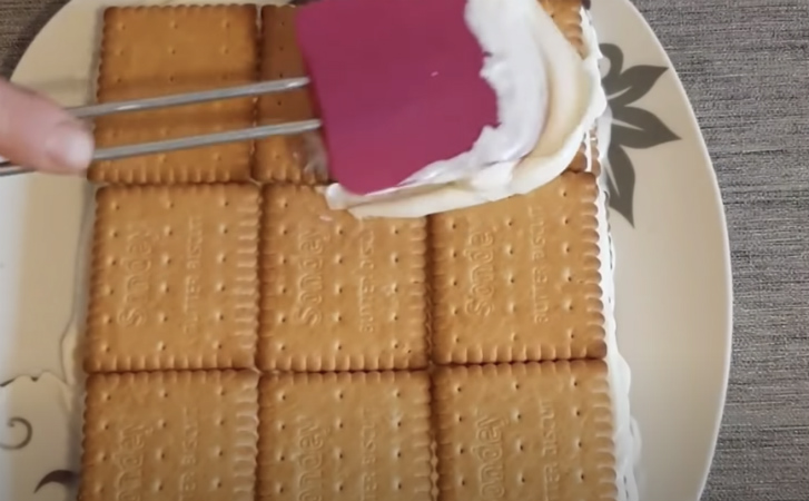 Творожную массу перекладываем в глубокую миску, заливаем ее сгущеным молоком, перемешиваем до однородной массы и сразу наносим ее тонкий слой на тарелку или блюдо, где и будем формировать весь торт. Выкладываем первый слой из печенья.