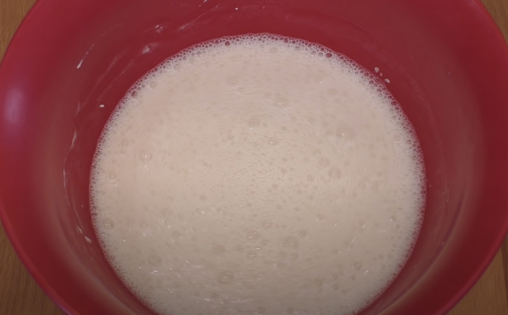 Первой делаем опару: крошим дрожжи в глубокую миску, добавляем к ним сахар и растираем ложкой в жидкую смесь. Сразу вливаем всю воду, она должна быть теплой, но не горячей. Теперь всыпаем 100 граммов муки и размешиваем все венчиком, чтобы не осталось комков.