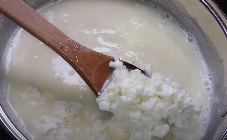 Готовится сыр очень просто. Доводим молоко до кипения и добавляем к нему творог. На большом огне снова доводим все до кипения. Со времени закипания засекаем ровно три минуты, затем огонь выключаем.