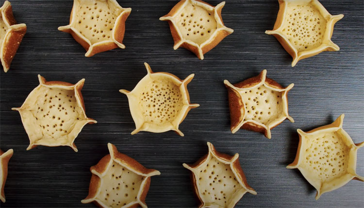 Блины жарим как обычно, а потом, пока они горячие, поджимаем им уголки, формируя корзинки.