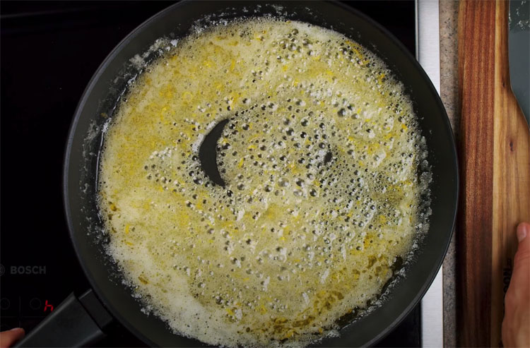 Как только корзинки готовы, переходим к начинке. Топим на сковороде сливочное масло, куда добавим сахар, сок, цедру лимона.