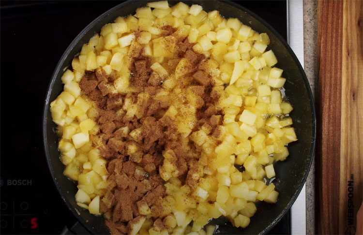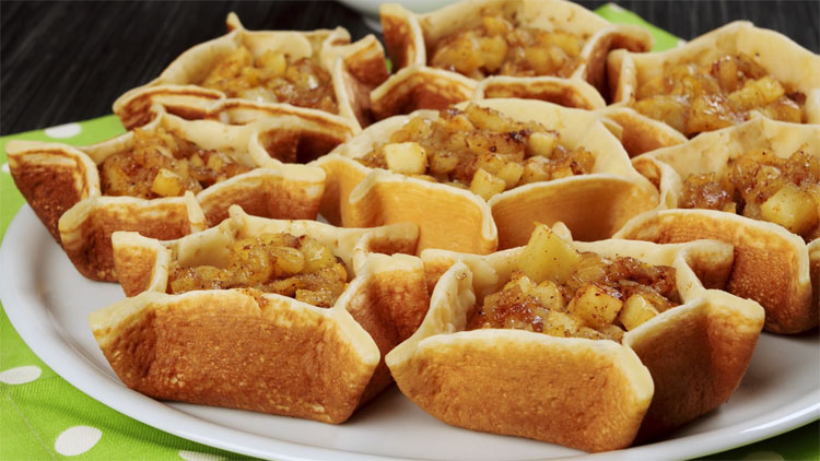 Жарим 20 минут, перемешивая с основой, а к конце добавляем корицу по вкусу. Теперь осталось только наполнить яблоком наши корзинки.