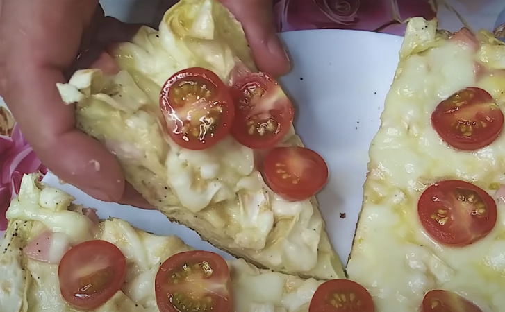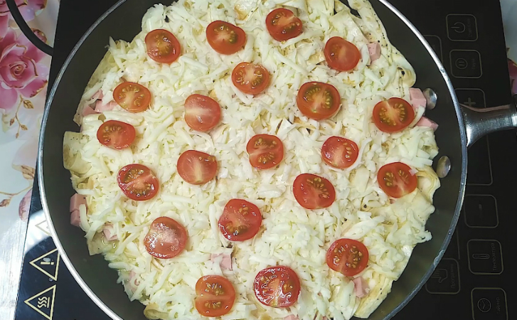 Чаще всего на завтрак готовят вкусный, но уже слишком привычный омлет или яйца. Лучше сделаем гораздо более вкусный вариант завтрака: нарежем соломкой тонкий лаваш, зальем его на сковороде яичной смесью с колбасой и получим своего рода быструю пиццу с плавленным сыром и помидорами черри, которой хватит на большую часть дня.