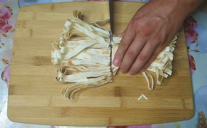 Лаваш нарезаем тонкими полосками. Длинные нам не нужны, поэтому полоски также режем пополам — удобнее будет сделать это кухонными ножницами.