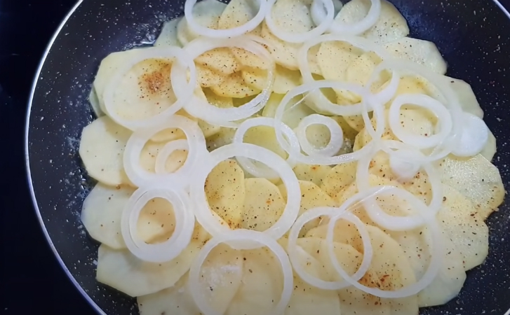 Разогреваем на сковороде масло и выкладываем картошку первым слоем по кругу, пусть каждый кусочек краем заходит друг на друга. Солим, перчим.